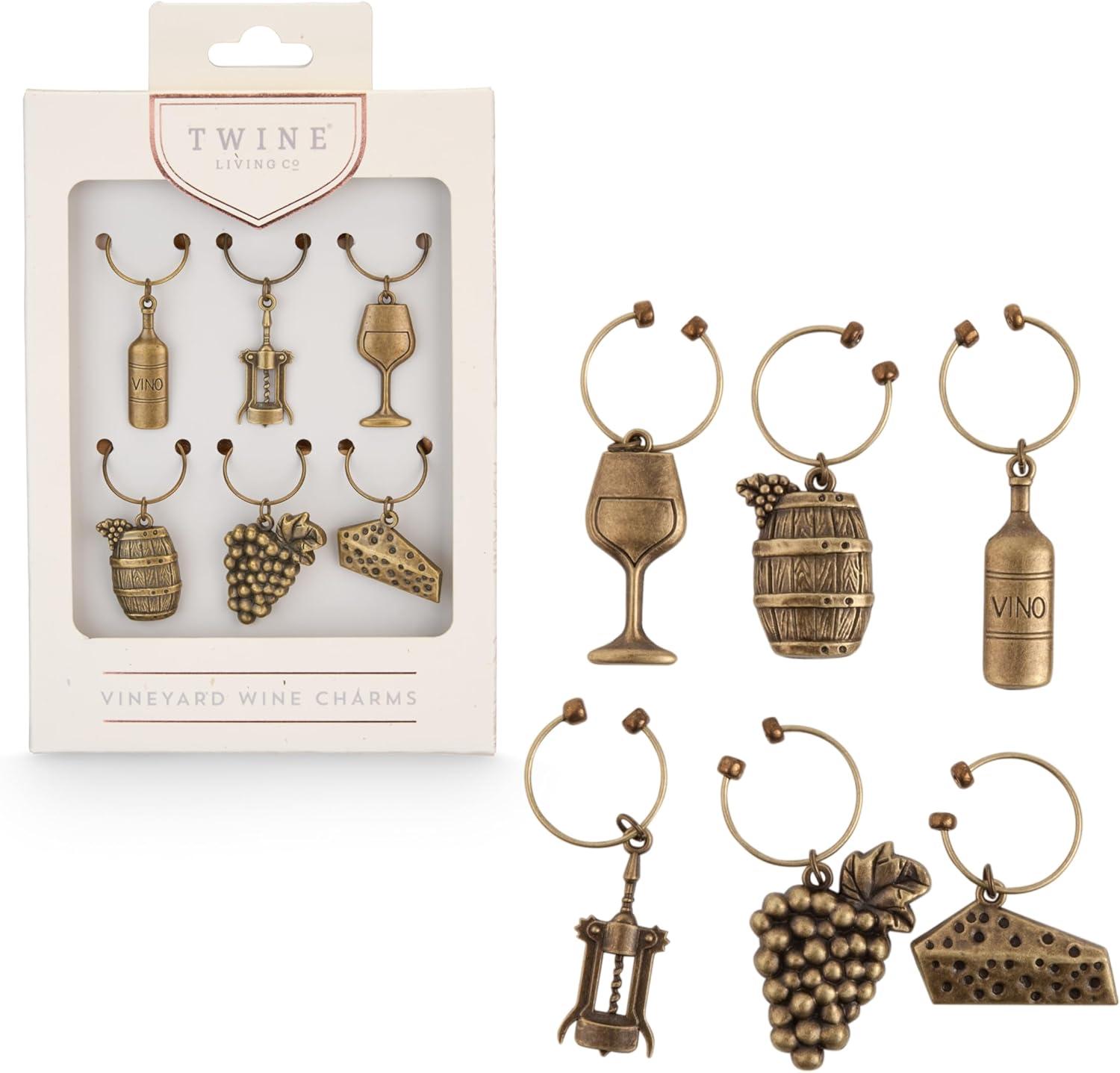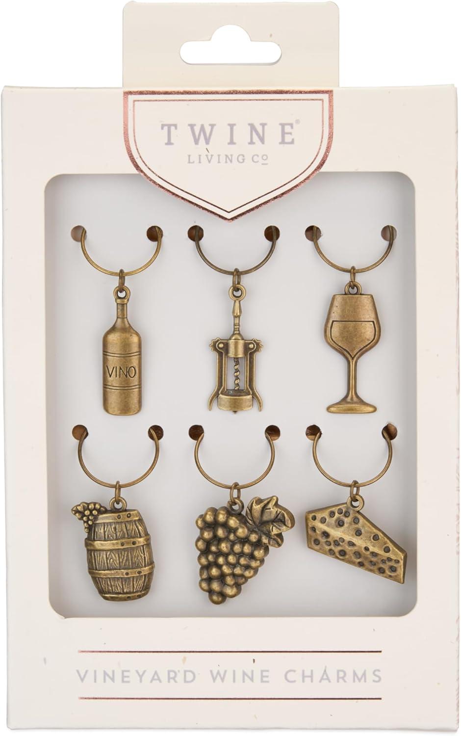 Twine Antiqued farmhouse decor wine charms and drink markers for wine glasses, 6 count(Vineyard)