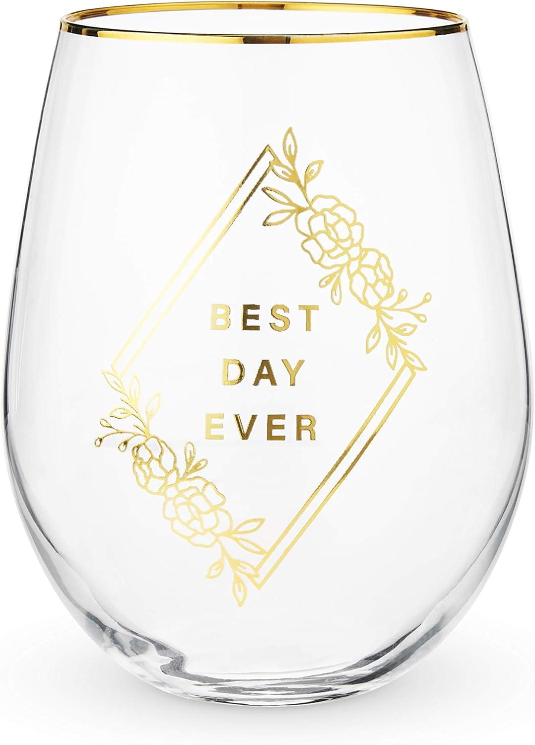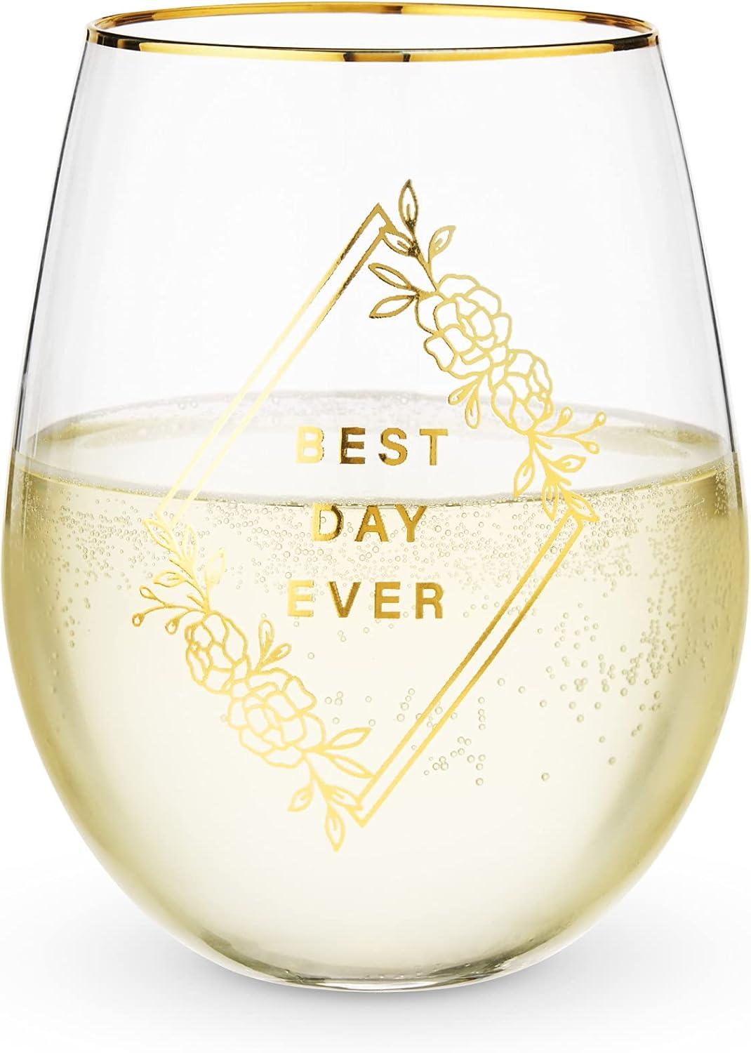 Commemorate the 'best day ever' with this Wedding Stemless Wine Glass and Stopper Set, ideal for sending happy couples off on their new adventure. Featuring gold details, text, and rim, this duo makes thoughtful gifting easier than ever.Set of 1 wine glass & 1 wine bottle stopperWine glass comfortably holds 16ozStopper fits standard wine bottlesElectroplated gold rim on wine glass with gold printing