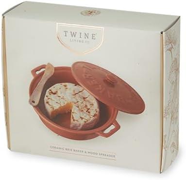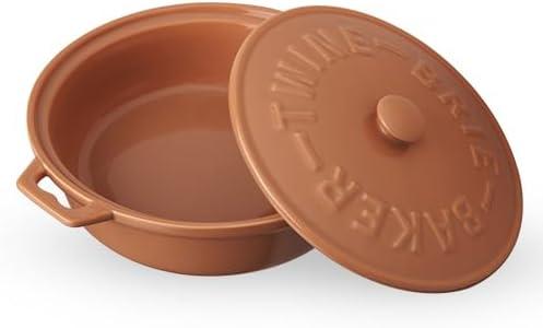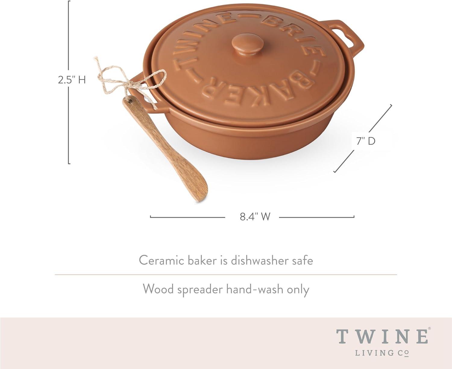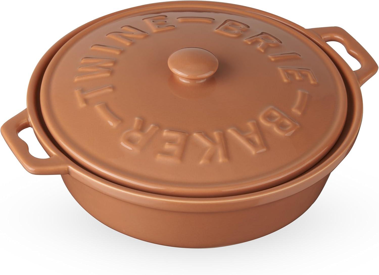 When it comes to guest-pleasing hors d'oeuvres, nothing beats baked brie. Our stoneware kitchen baking dish with lid makes preparing this delectable dish easier than ever: simply add brie to the ceramic baking dish, top with a drizzle of honey or spread of your favorite jam, bake for 15 minutes in a 350 degree oven, & enjoy! Terra cotta stoneware bakeware baker with lid and handles. 7 inch diameter. Oven-safe up to 350 degrees Fahrenheit. Ceramic bakeware set with wood spreader. Make brie cheese bites with cute baking accessories like this ceramic casserole dish with lid.