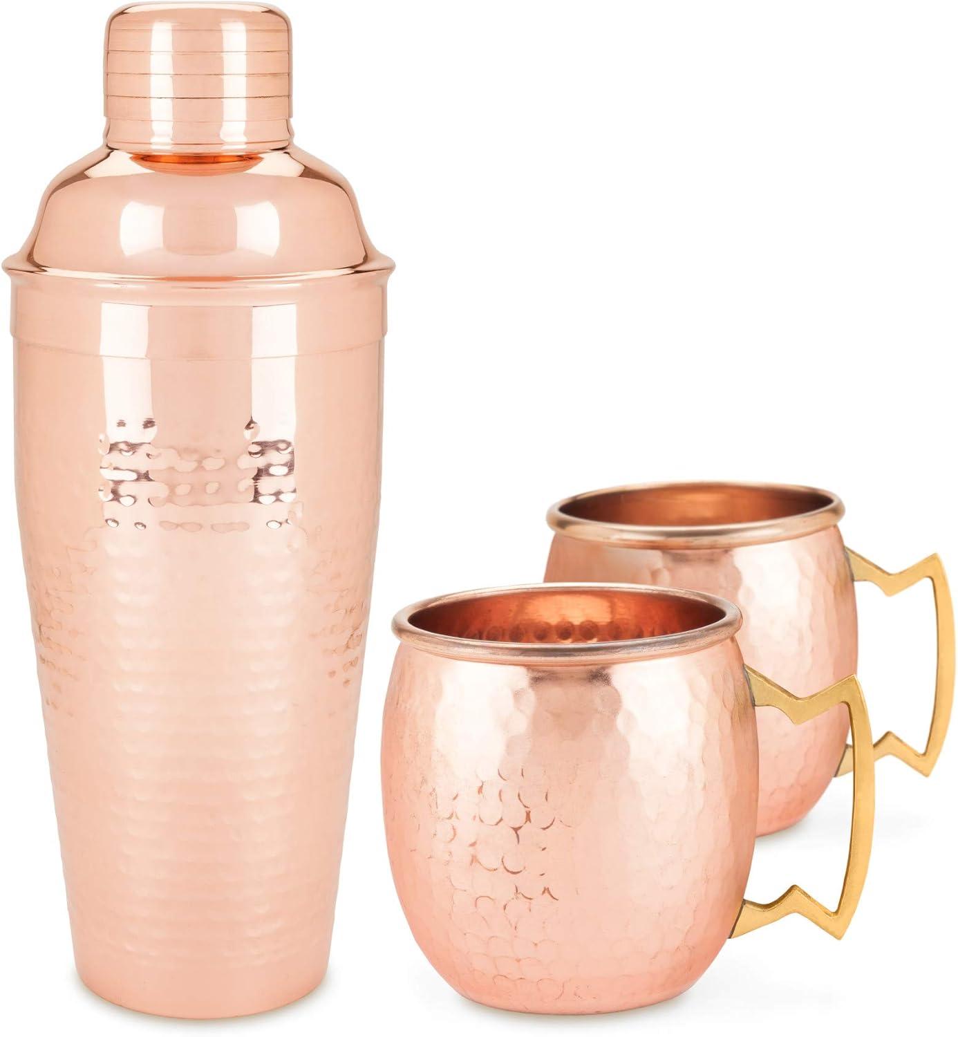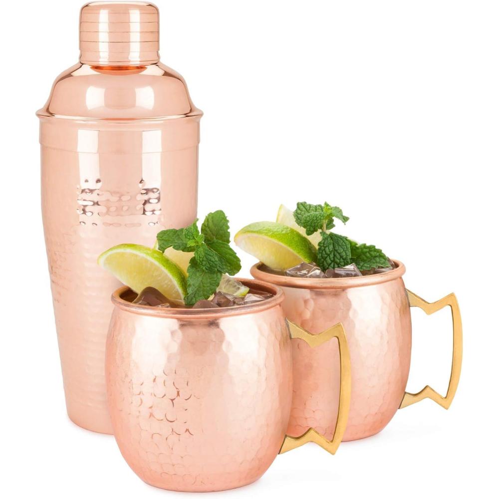 A hammered surface and gleaming copper finish draw light to this exquisite classic cocktail shaker and two matching Moscow mule mugs. The three-piece set is a gorgeous accent in any kitchen or atop any bar cart.Two 16-oz mugs & one 25-oz shakerFood-safe copper & stainless steelMakes a great gift!