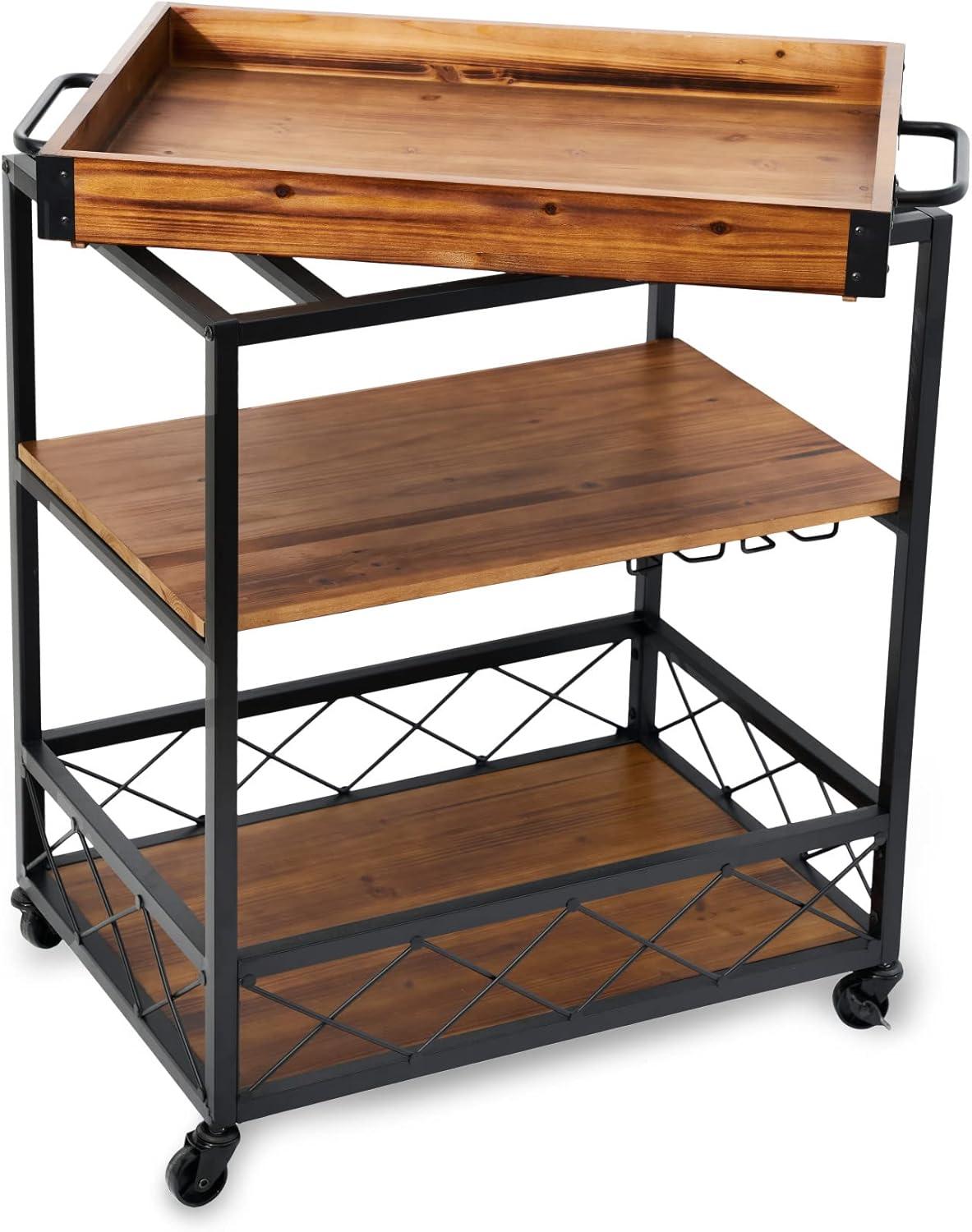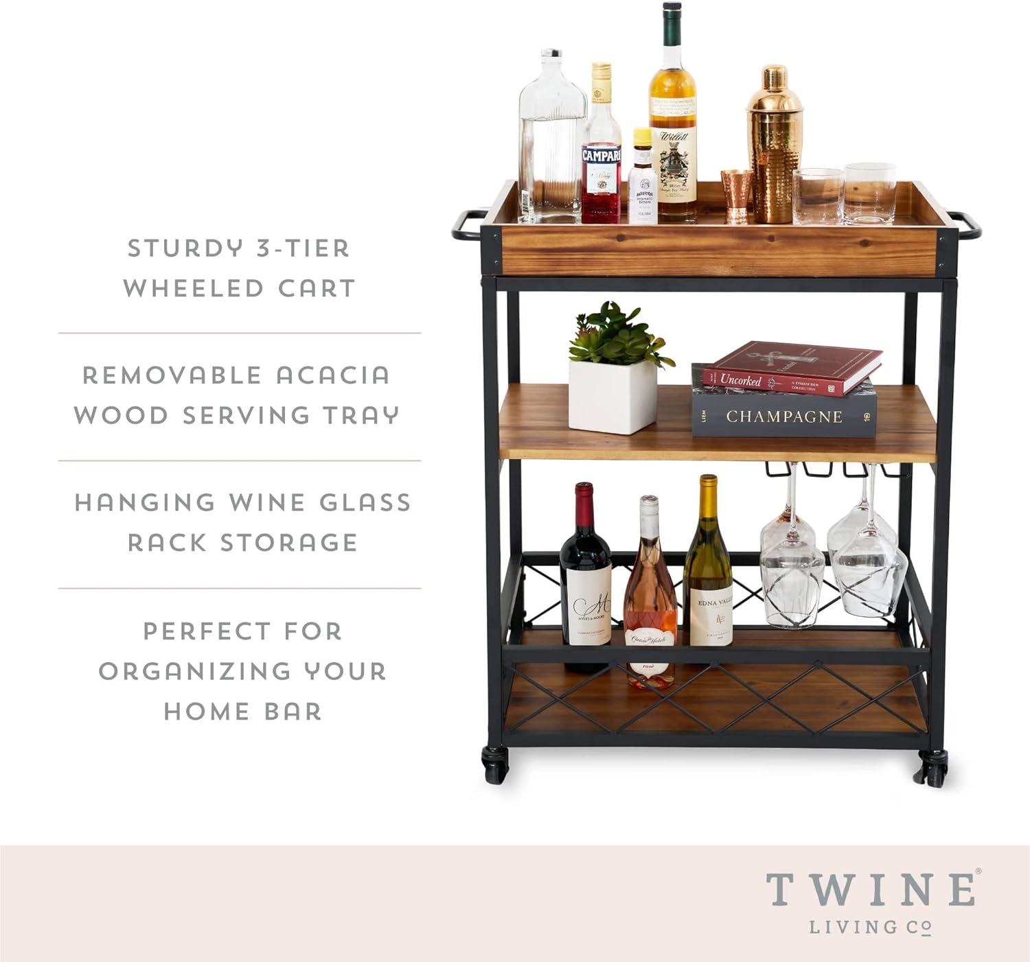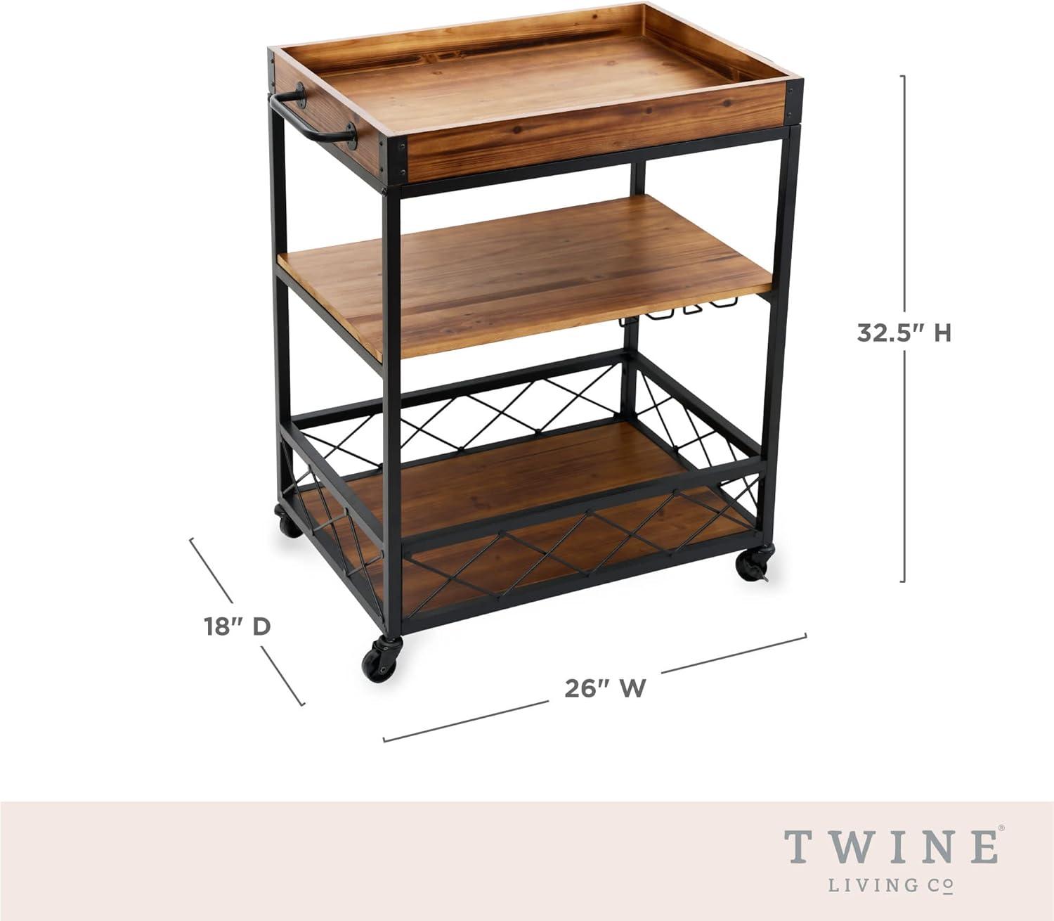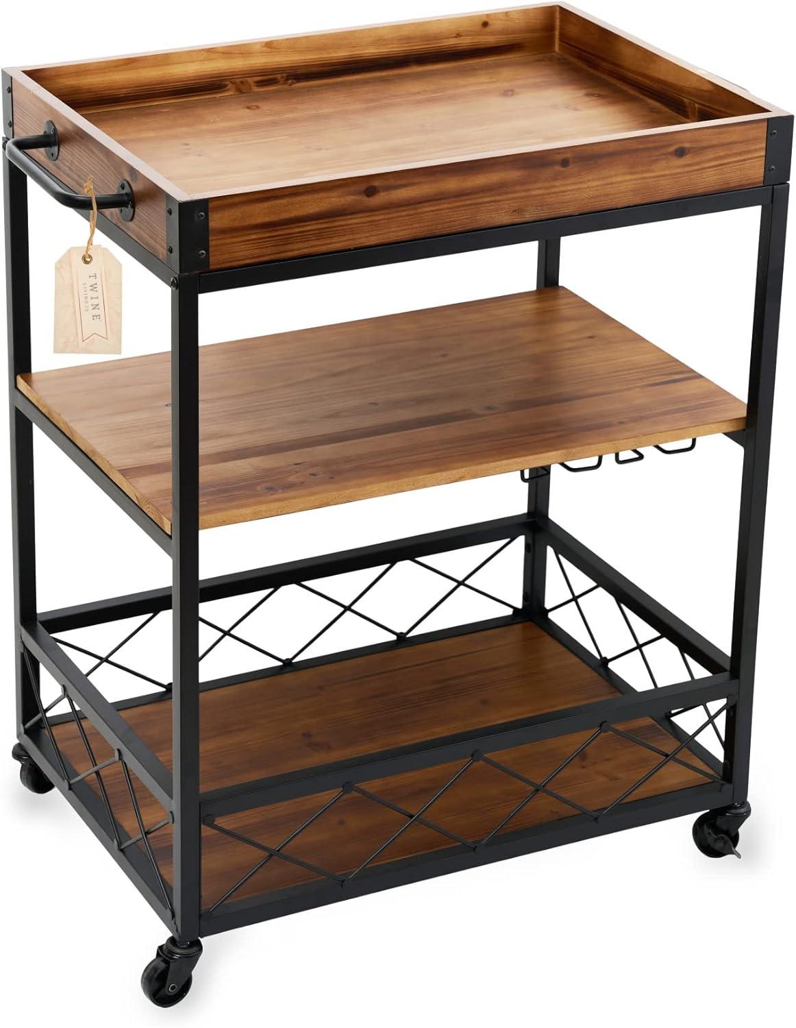 Twine Modern Manor Bar Cart, Wheeled Rustic Industrial Portable Serving Cart with Removable Tray for Liquor, Glassware, and Wine, Wood, Metal, Set of 1