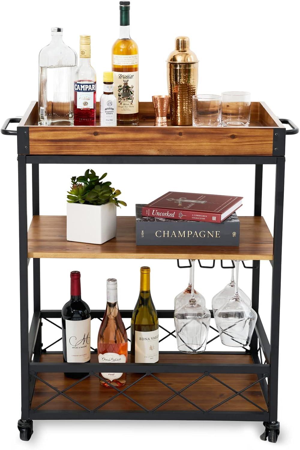 THE PERFECT SIZE FOR YOUR BAR ACCESSORIES – This bar cart has 3 shelves, a hanging wine glass rack storage, and a removable serving tray with handles. Arrange your corkscrews, shakers, strainers, and jiggers with your whiskey, gin, vodka, and wine.