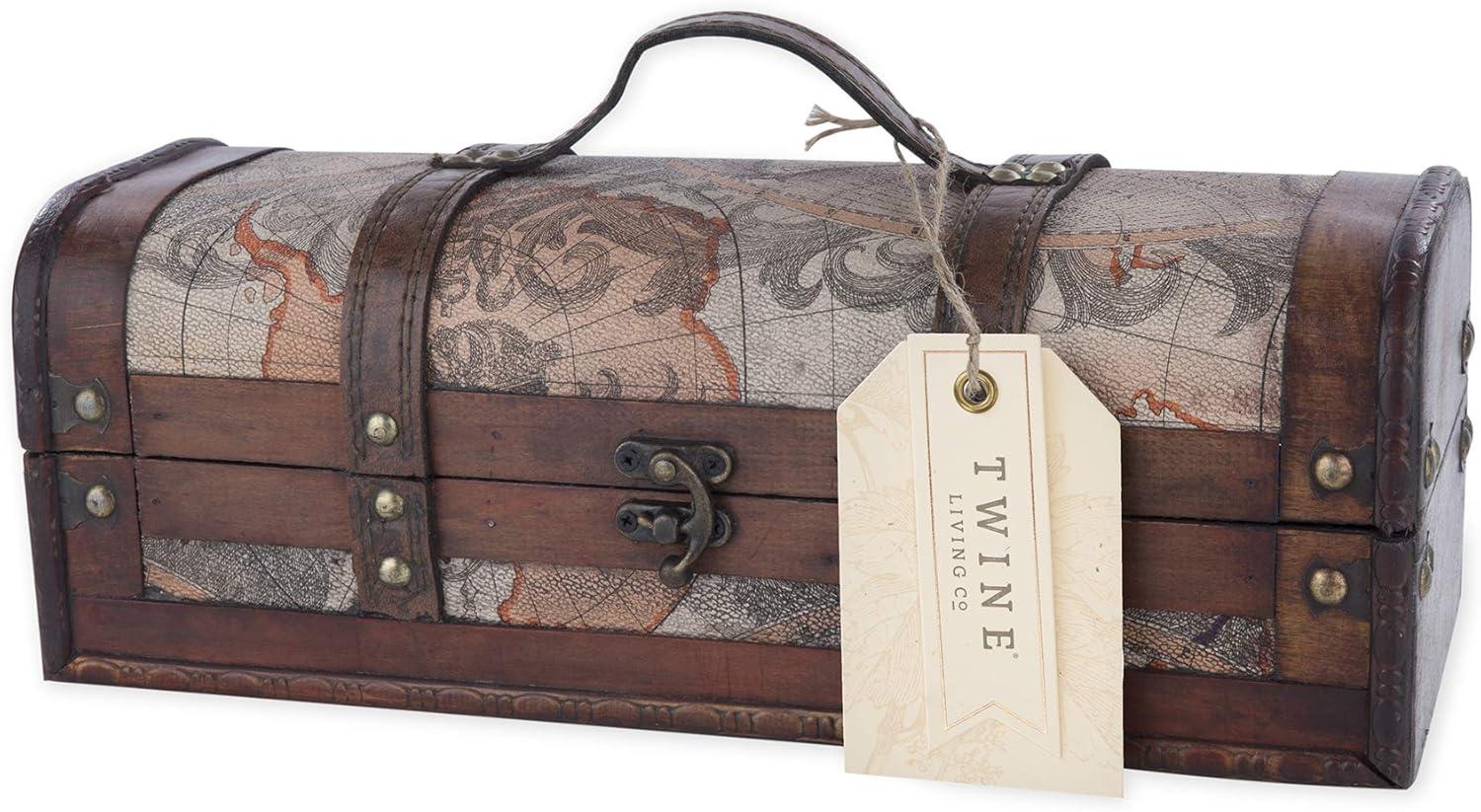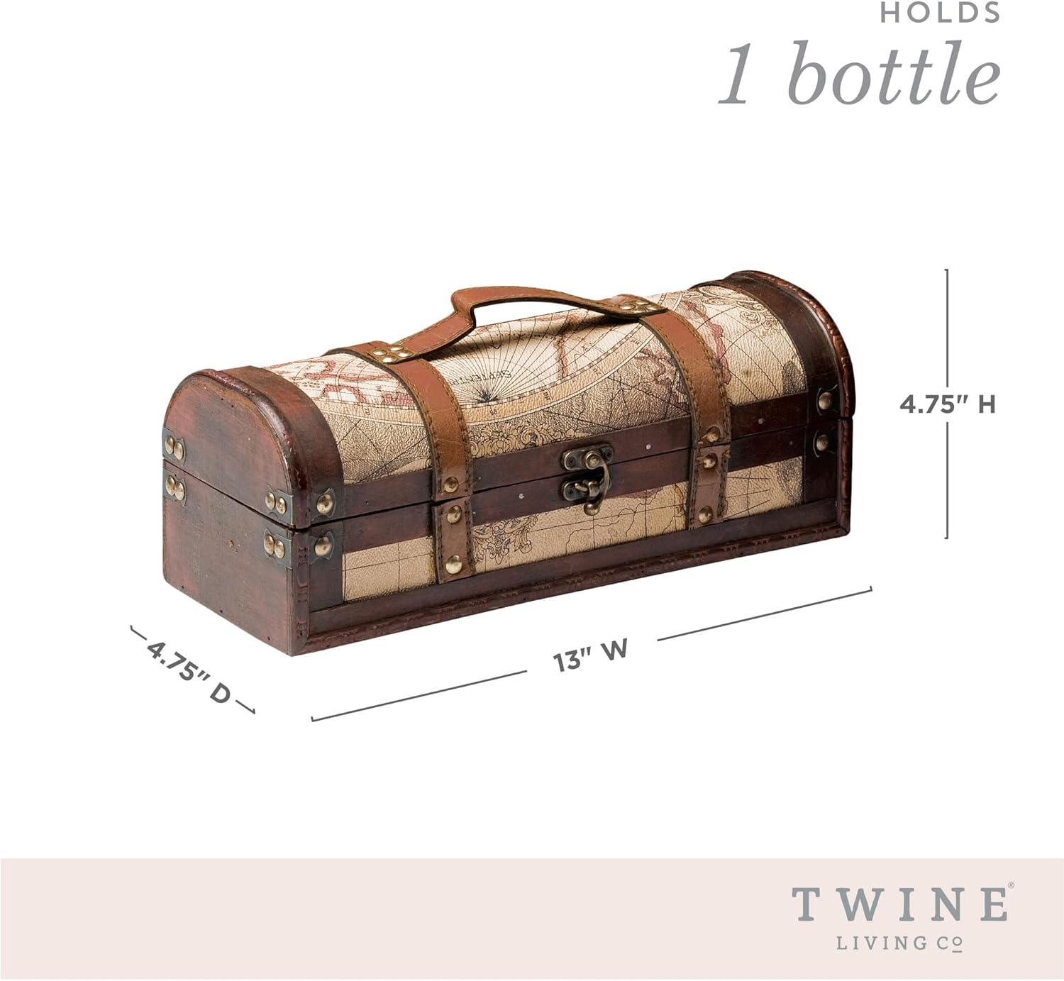 Twine Old World Wine Bottle Gift Box, Wooden Wine Box with Lid and Handle, Wood, Faux Leather, Antique Map Design, Holds 1 Bottle(1 Bottle)