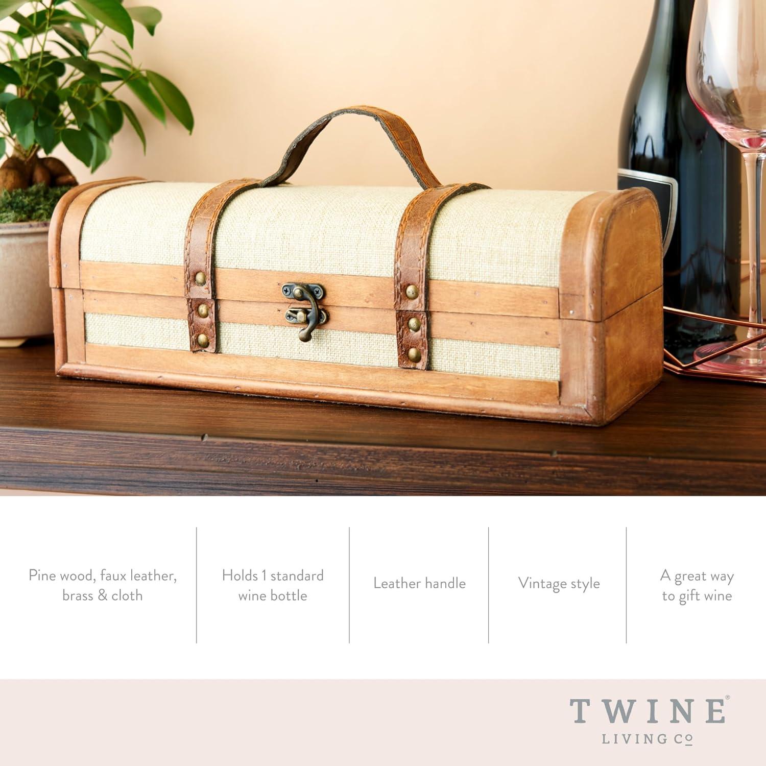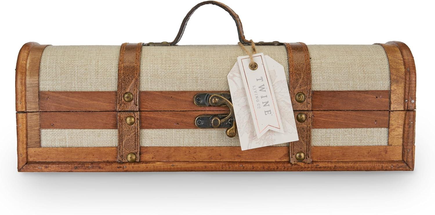 Twine Vintage Trunk Wine Bottle Gift Box, Wood Wine Box with Lid and Handle, Wood, Faux Leather, Brass, Cloth, Holds 2 Bottle(Vintage Striped)